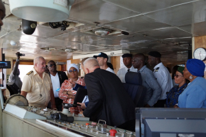 После приветствия капитаном СТМ «Атлантида» Якубиным Михаилом на причале министра рыболовства и морской экономики вся представительная делегация около 40 человек поднялась на борт судна. Гостям были показаны научные лаборатории и ходовой мостик судна.
